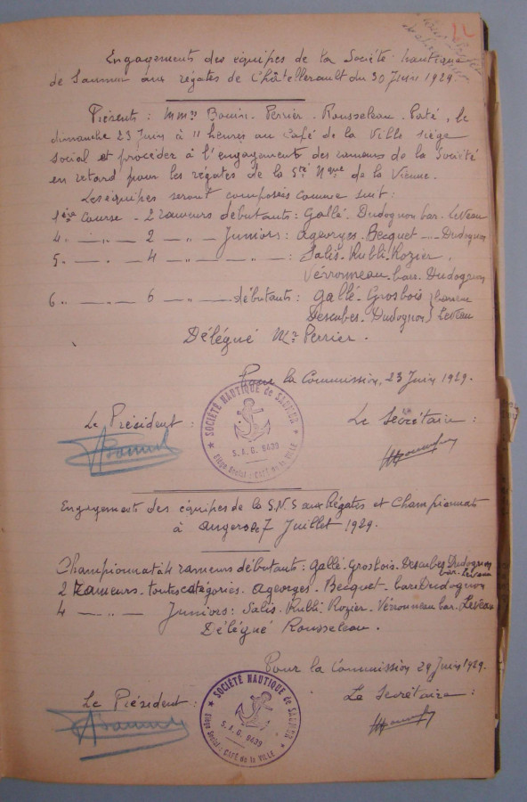 Après la collecte, en 2023, des archives de la Fédération des associations sportives Jeanne d'Arc (fonds classé en 87Z) et du Tennis Cub du Saumurois (en cours de classement) dans le cadre de la Grande collecte des archives du sport, une nouvelle association vient de faire don de ses archives : la Société nautique de Saumur aviron, créée au milieu du XIXe siècle. Peu volumineux, le fonds permet de documenter l'histoire de la société au cours de l'Entre-Deux-Guerres, sous l'Occupation et au sortir de la Seconde Guerre mondiale.